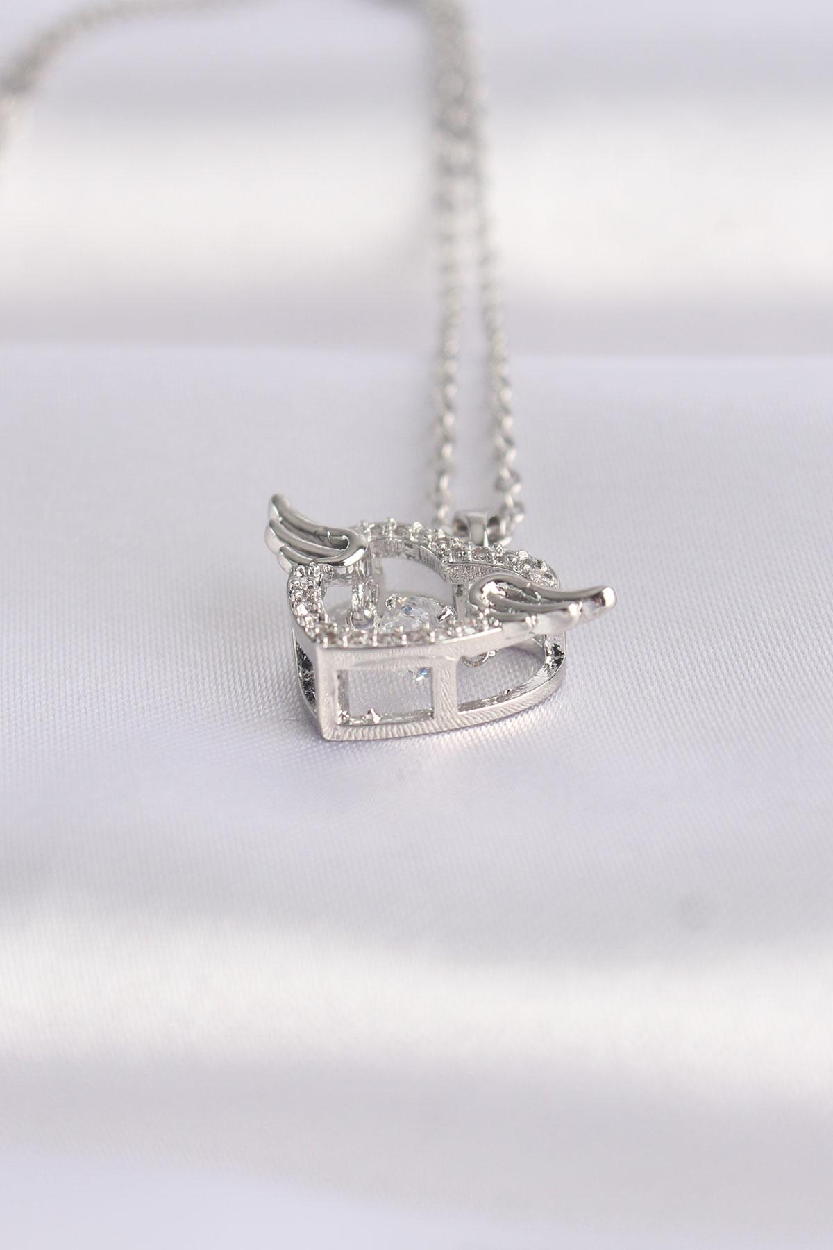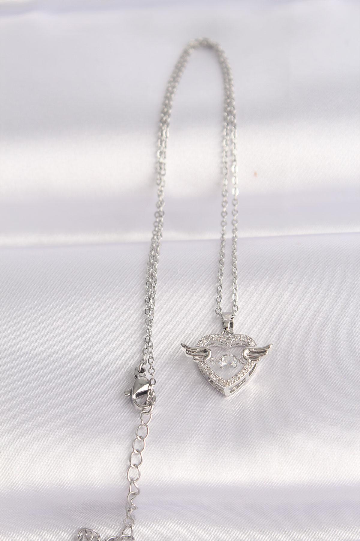 Çelik Zincir Gümüş Renk Zirkon Taşlı Kanatlı Kalp Kolye