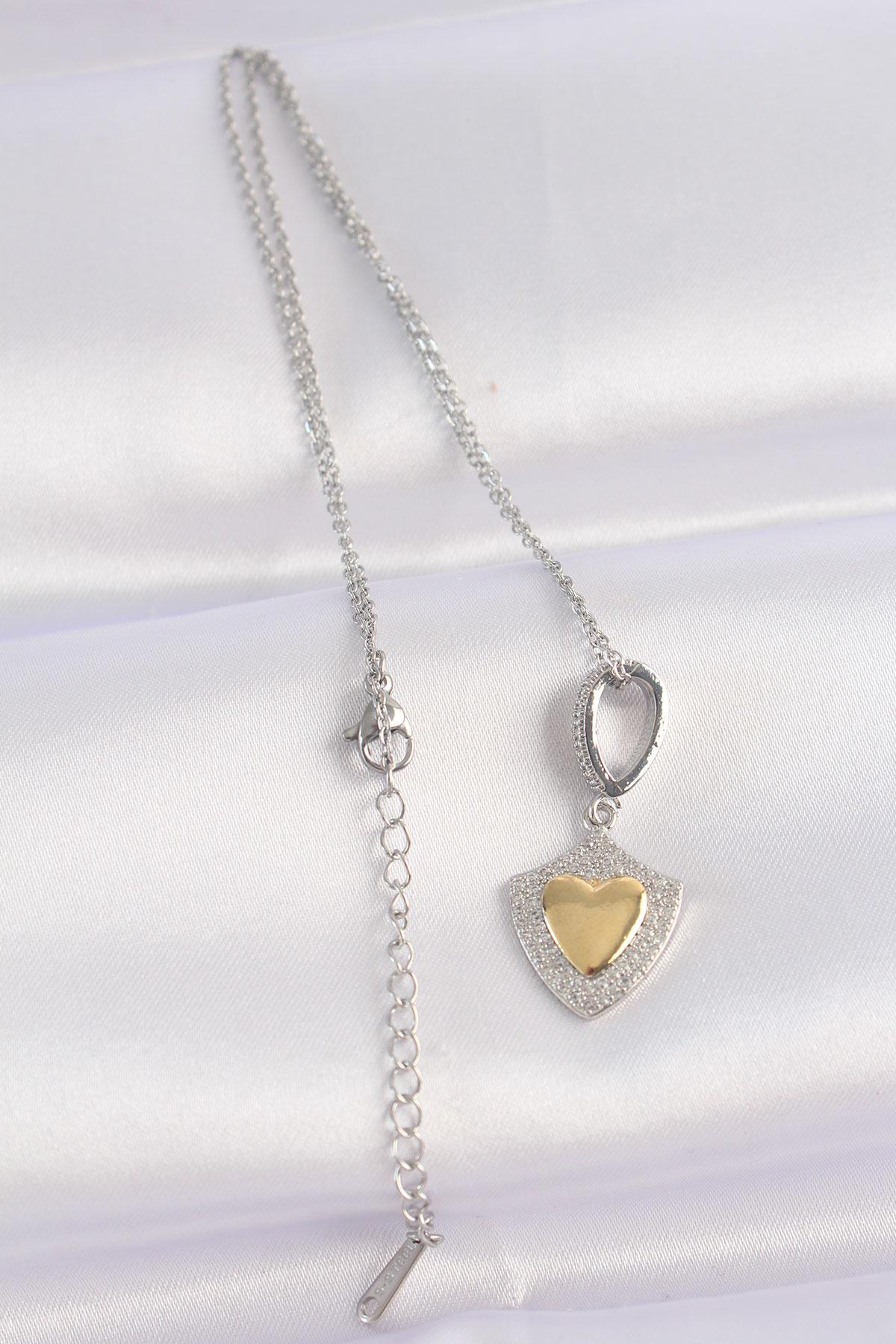 Çelik Zincir Gümüş Renk Zirkon Taşlı Tasarım Altın Renk Kalp Kolye