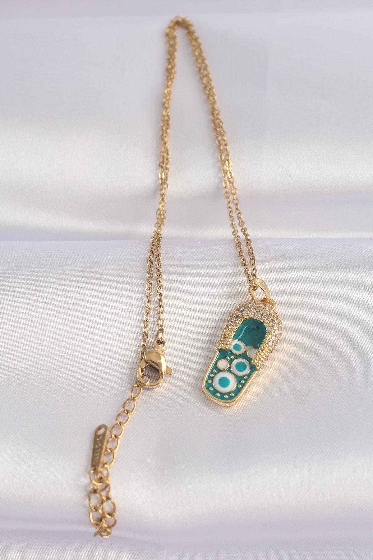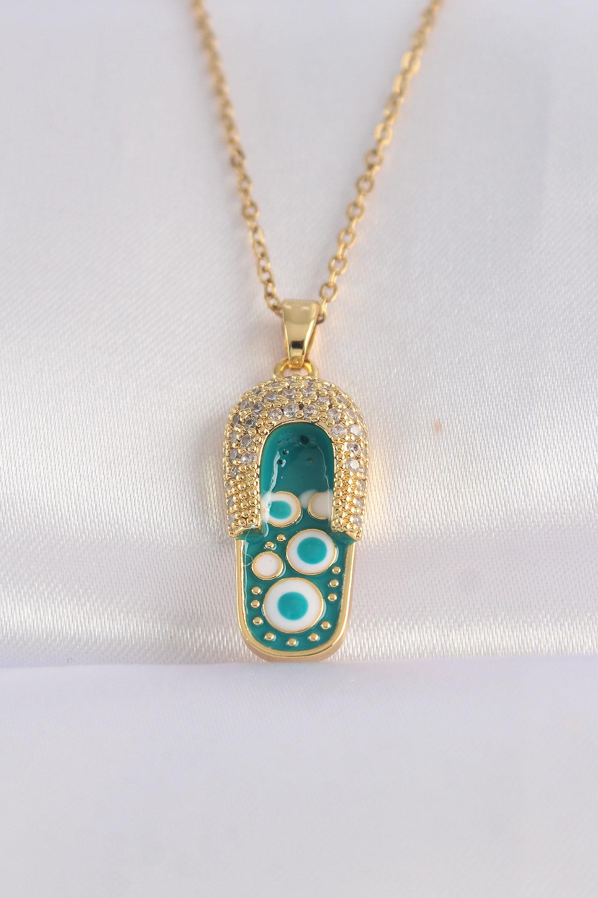 Çelik Zincir Zirkon Taşlı Altın Renk Nazarlı Terlik Tasarımlı Kolye