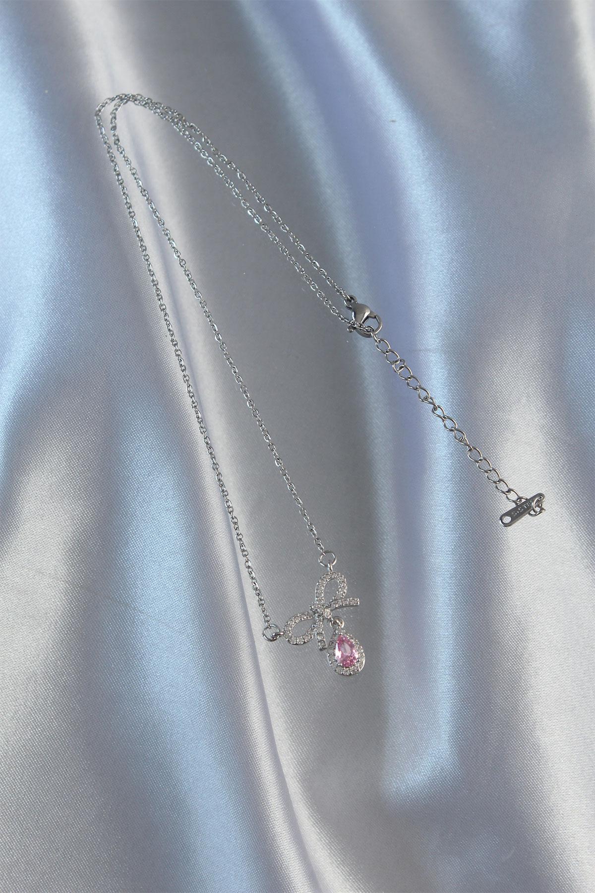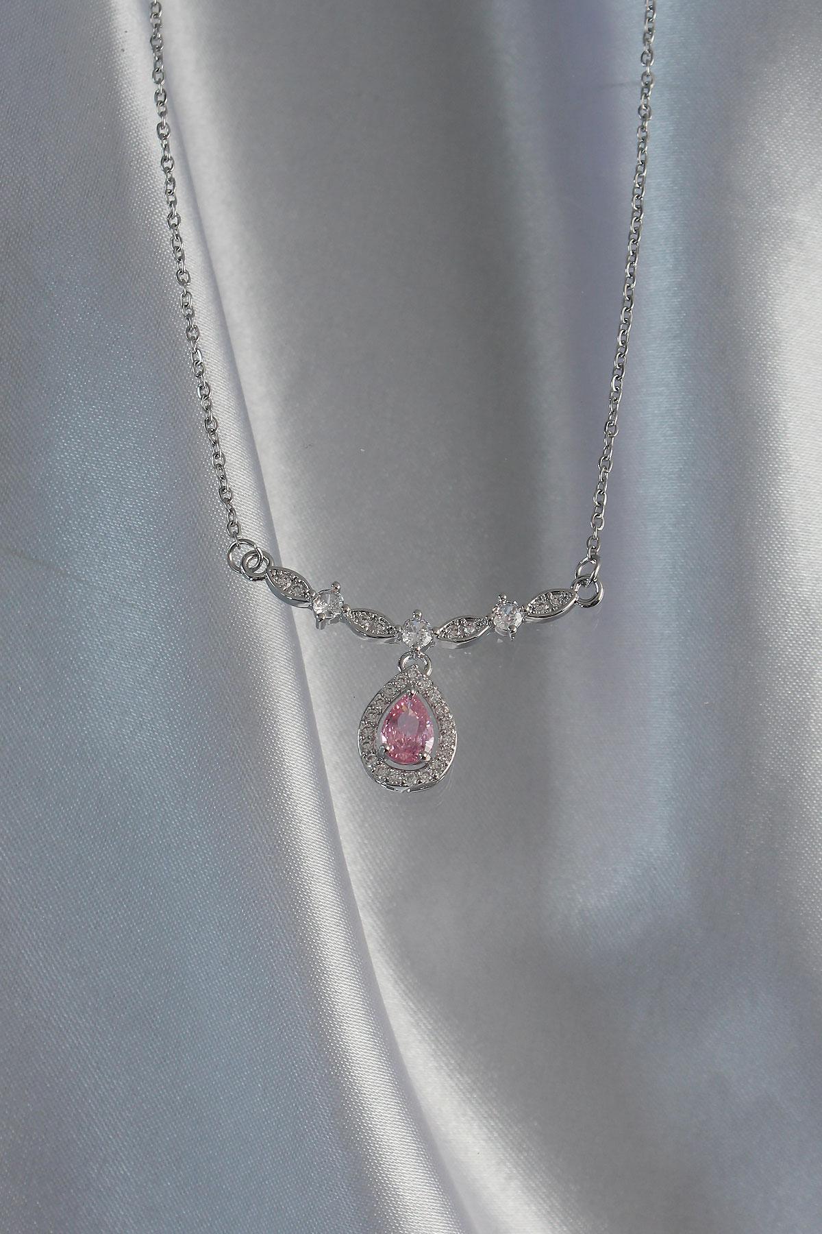Çelik Gümüş Renk Pembe Zirkon Taşlı Damla Kolye