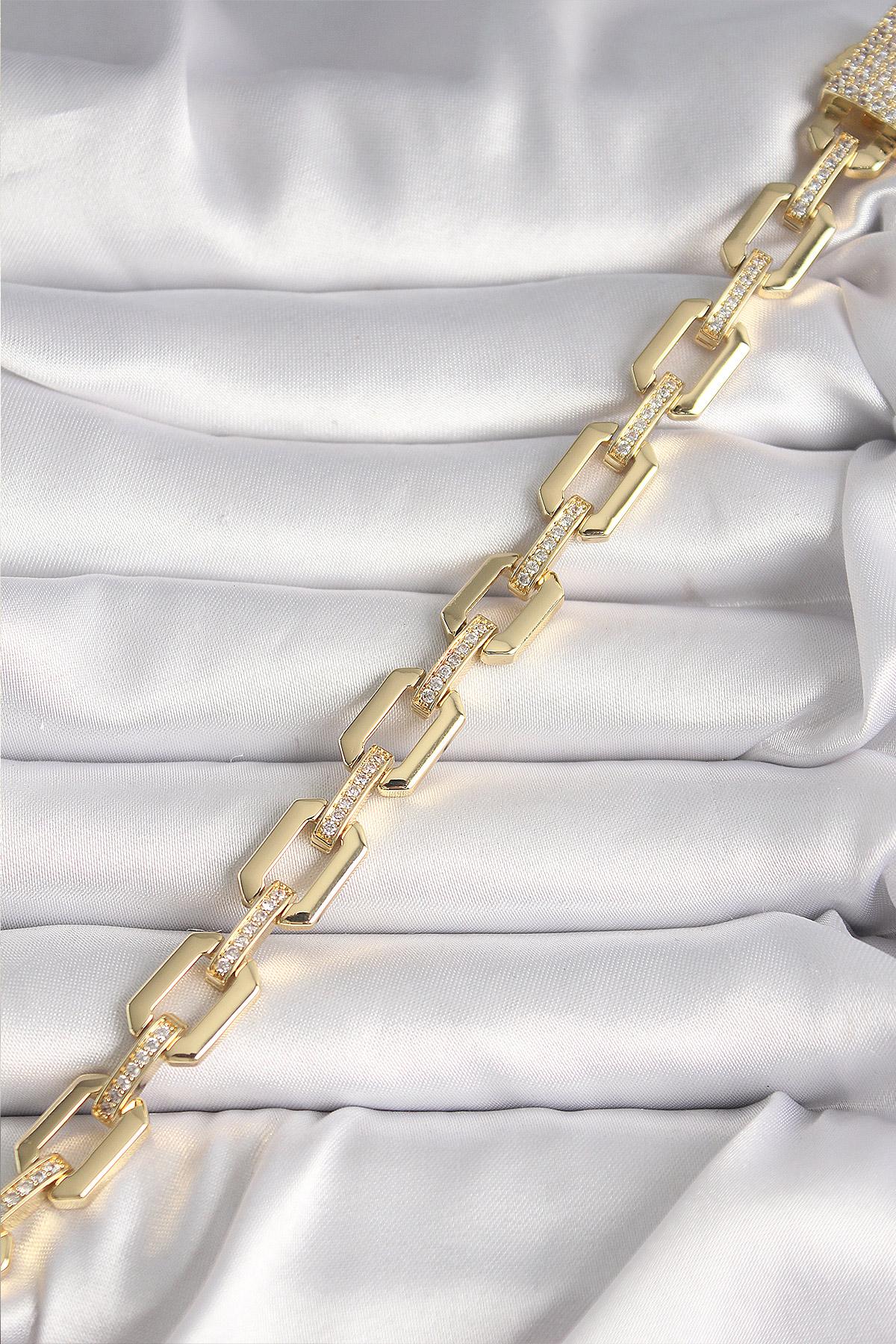 Pirinç Gold Renk Zirkon Taş Detaylı Kare Zincir Model Xuping VIP Exculusive Seri Kadın Bileklik