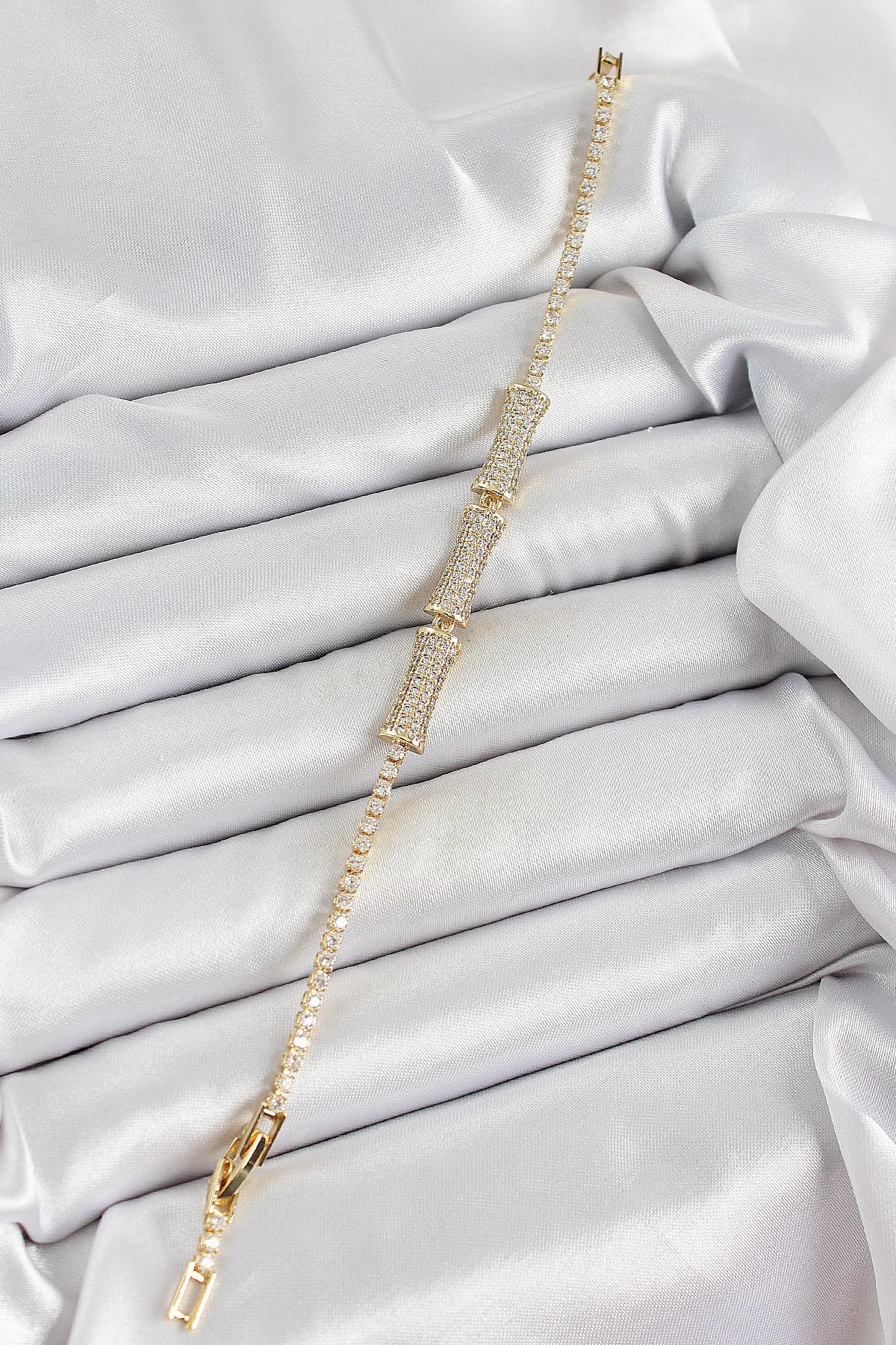 Pirinç Gold Renk Zirkon Taşlı Kemik Model Kadın Bileklik