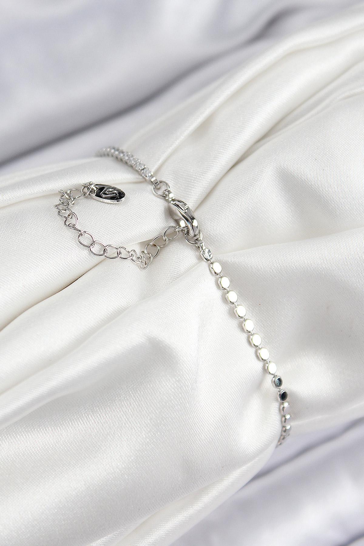 Pirinç Zirkon Taşlı Nazar Model Ezme Zincir Gümüş Renk Kadın Bileklik