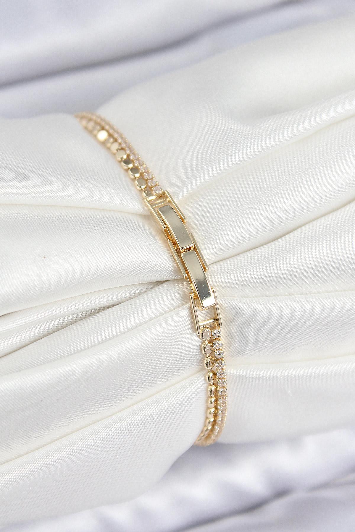 Pirinç Zirkon Taşlı Ezme Zincirli Sıralı Model Gold Renk Kadın Bilekilk