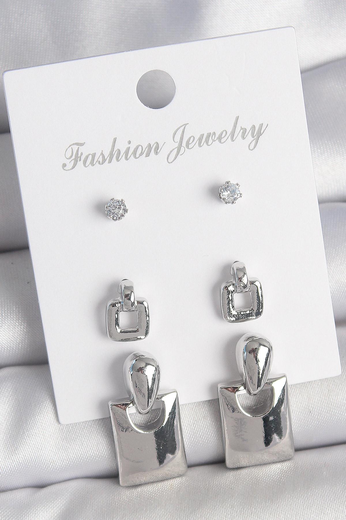 Pirinç Gümüş Renk Zirkon Taş Detay Sallantılı Kare Model 3 Çift Kadın Küpe Seti