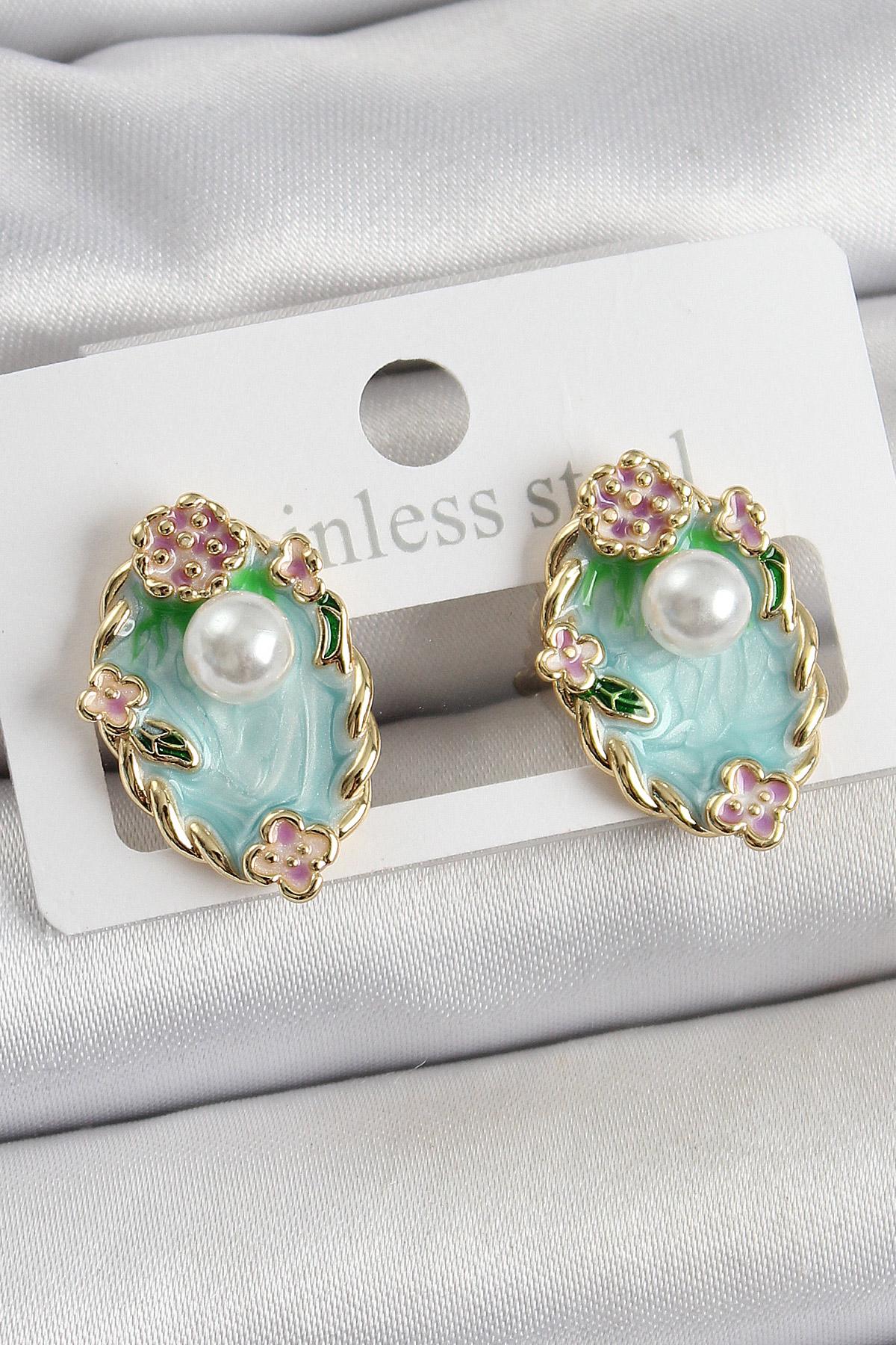 Pirinç Yeşil Mineli İnci Detaylı Sanatsal Portre Model Gold Renk Kadın Küpe