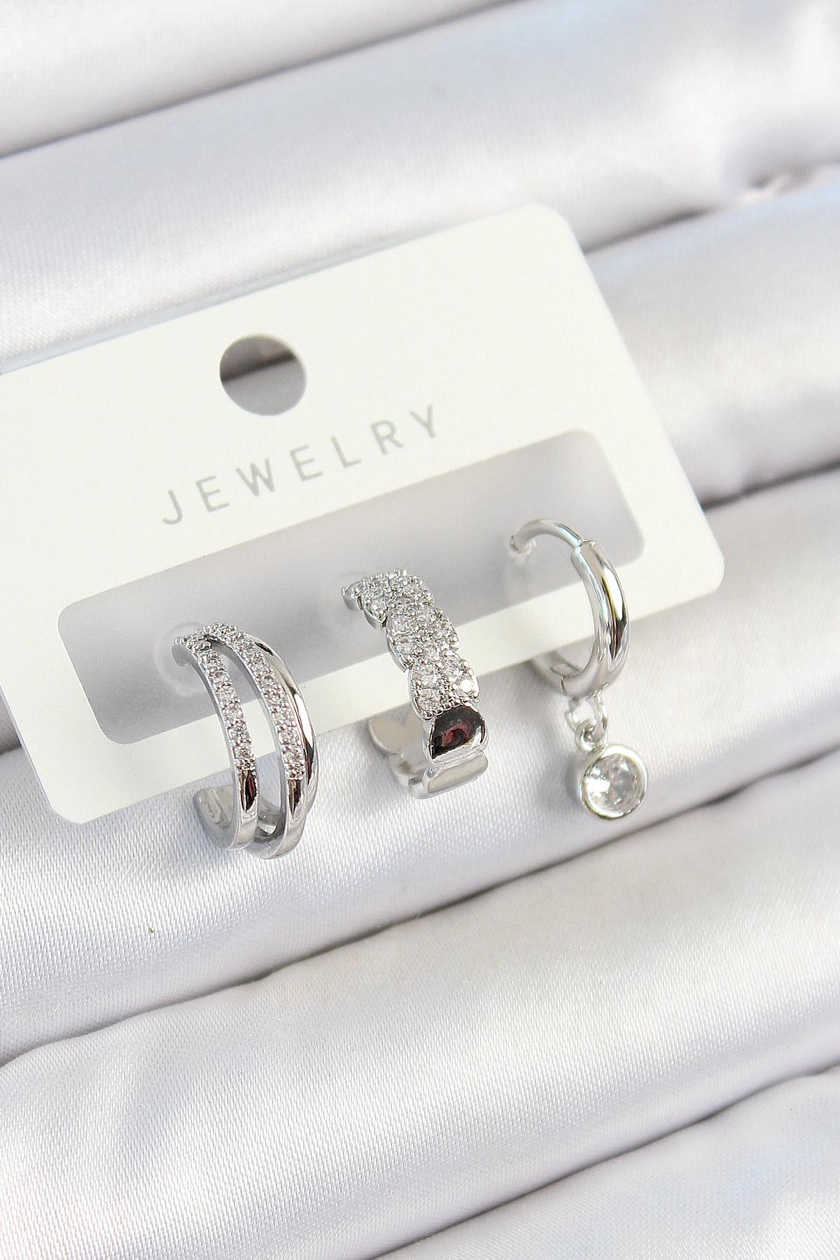 Pirinç Zirkon Taşlı Halka Model Gümüş Renk 3lü Çift Kadın Küpe Set