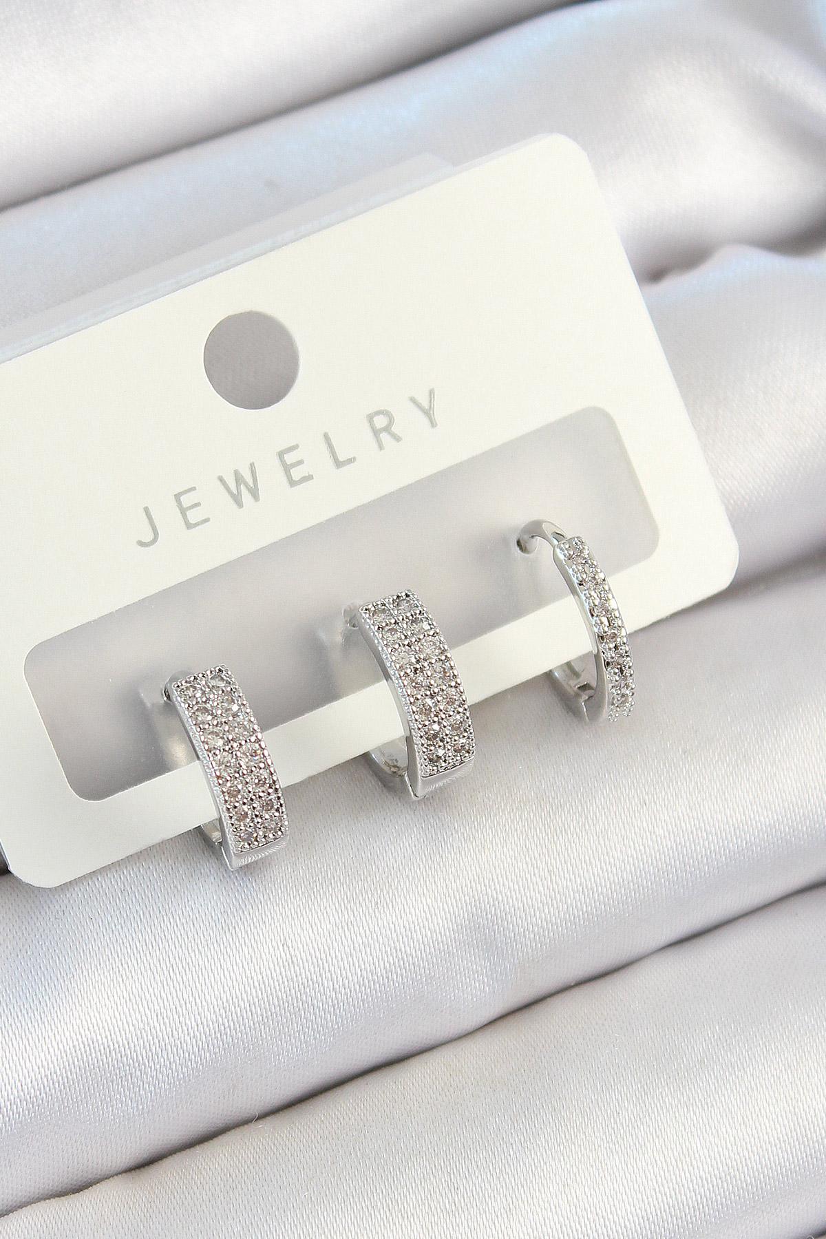 Pirinç Zirkon Taşlı Halka Model Gümüş Renk 3lü Çift Kadın Küpe Set